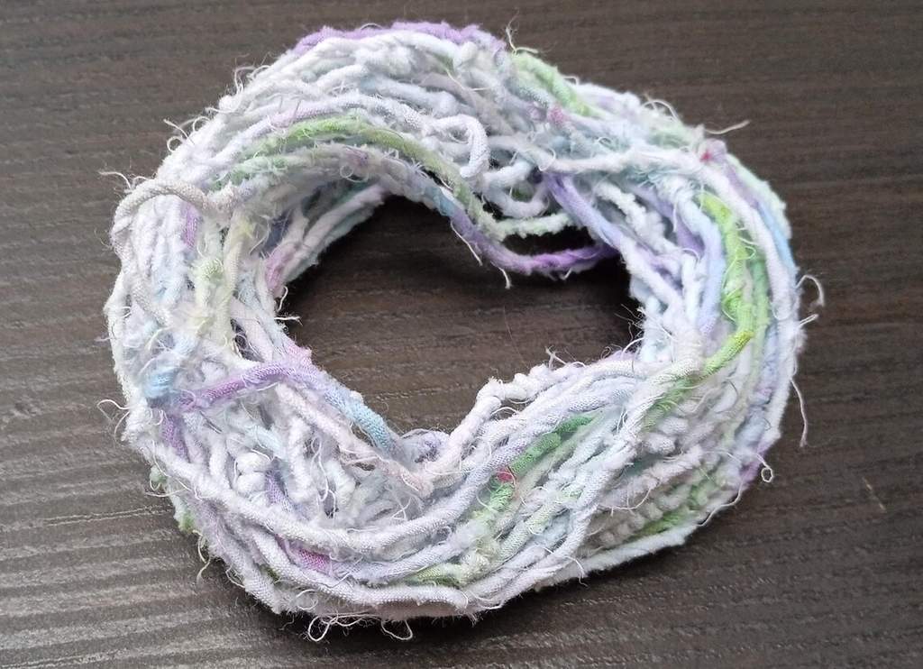 A sheer and finest of quality muslin fabric is hand dyed by me using the tie dye Shibori method. Then I meticulously strips of this fabric and sew the short ends together to make a long ribbon yarn. This ribbon yarn is then tightly hand twisted by me to make this resulting yarn.