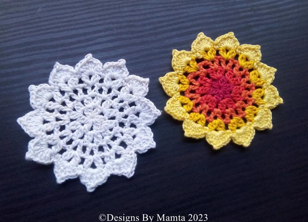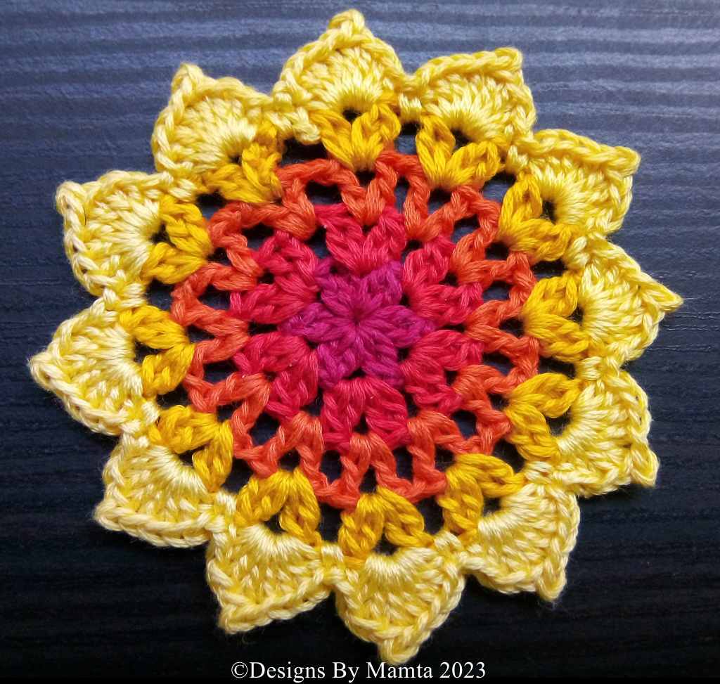 I was designing a different mandala pattern and this pattern just popped up on its own while I was crocheting. Seriously, I didn’t make it. It had a mind of its own and it all happened on its own. I love it when this happens. It’s like the universe is telling me to meditate on my Anahata Chakra.
