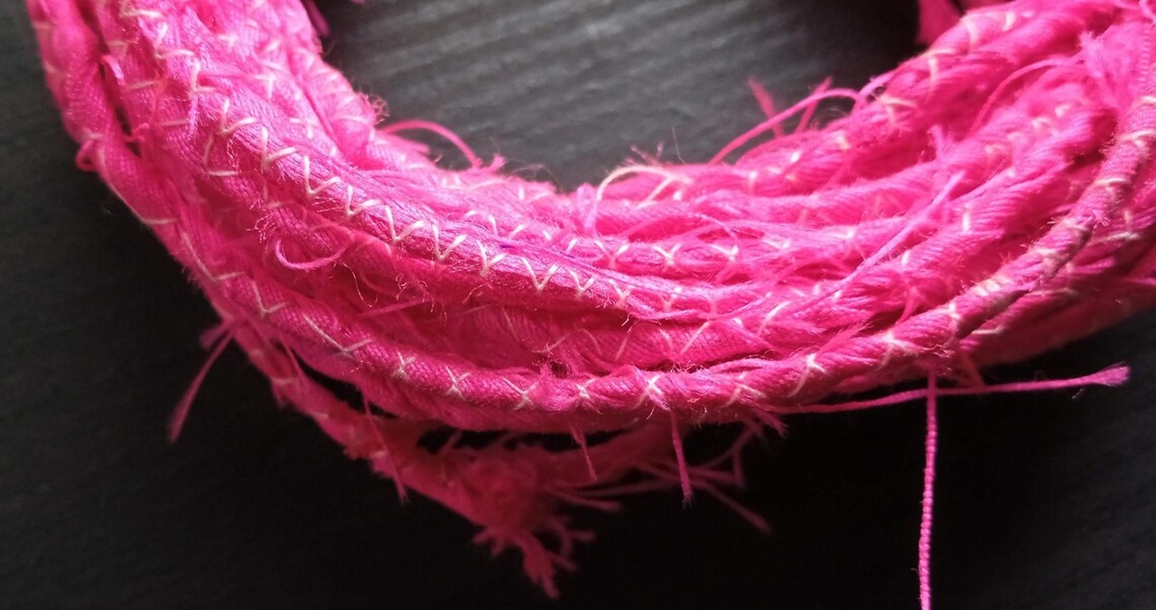 A handmade cord made with polyester fabric. “Zig Zag Zoom” is a hemmed cording made with leftover fabric that has been cut into strips, joined and sewed using the zig-zag stitch. The edges are left raw and unfinished.