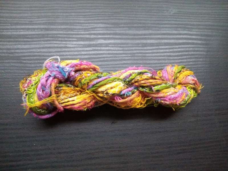 This beautiful yarn is recycled from beautiful polyester Indian sarees. I used stripes of different colored ribbons in a systematic manner starting with a specific unique color & ending with another unique color.