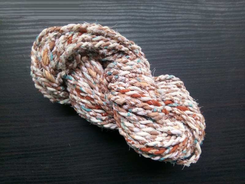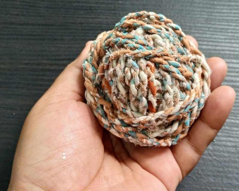 I use a floral muslin cotton sari fabric in different colors to make a ribbon, then I hand twisted the long yarn. It is very unique because the colors will keep on blossoming and changing in each and every yard of yarn.