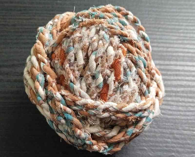 You will love this Neutral Rag Rope! This beige, blue, brown and white variegated twine is made by me using muslin cotton fabric ribbons. I sell new( not recycled) sari fabric by the yard in my shop. I end up with loads of small fabric scraps in the end. I recycle those scraps to make different things, one of which is this twine/ yarn.