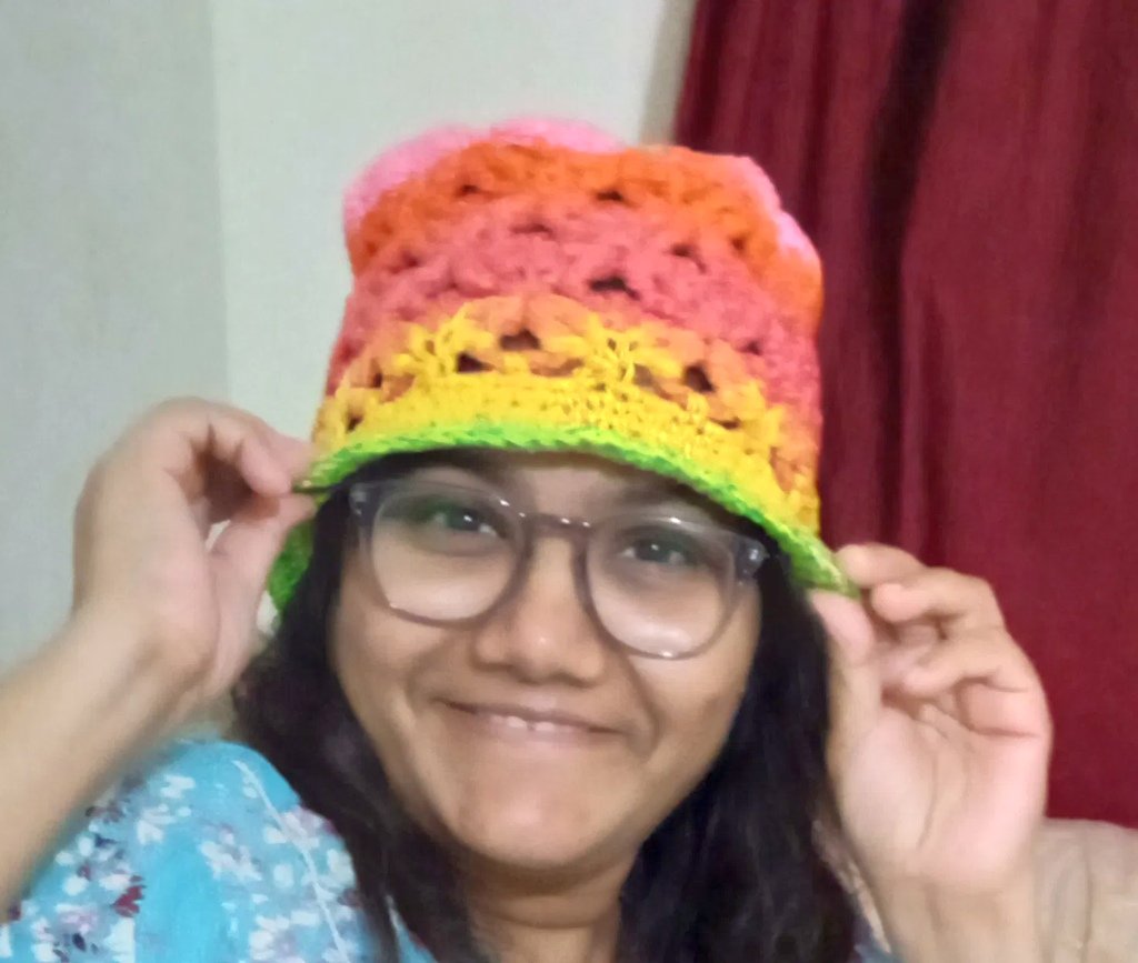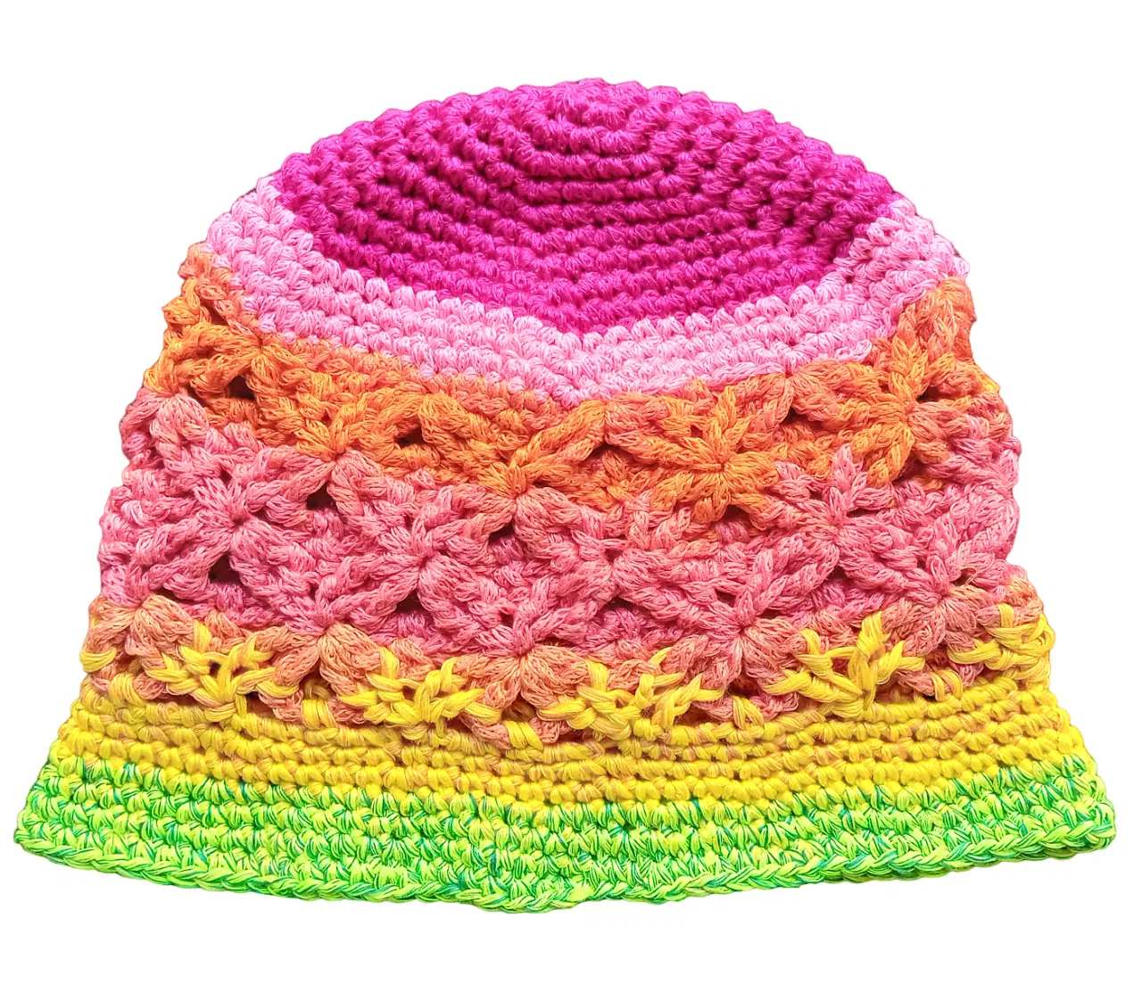 “Poppins Hat” is bucket style hat with a lovely floral pattern. It is inspired by my “Ixora Bag” pattern. The hat features a simple base, a lacy floral design in the center, a brim and buttons.