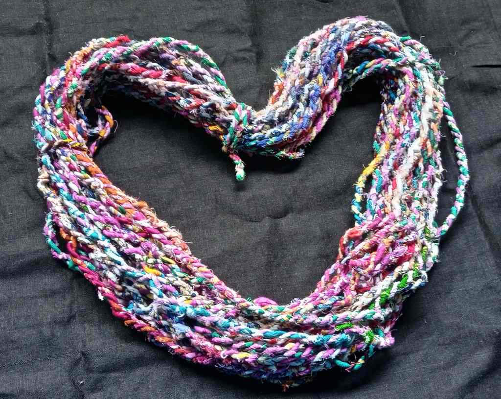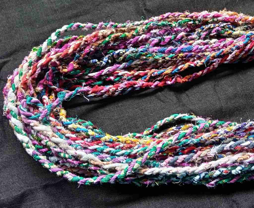I sell new (not recycled) sari fabric by the yard in my shop. I end up with loads of small fabric scraps in the end. I recycle those scraps to make different things, one of which is this twine/ yarn.